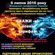 Повідомляємо, що на виконання рішення Ради ФПУ від 23.06.2016 року «Про позицію і дії профспілок на захист прав та інтересів працюючих в умовах шокового підвищення ціни на газ і тарифів на житлово-комунальні послуги» 06 липня 2016 року в м. Києві відбудеться Всеукраїнська попереджувальна акція протесту.