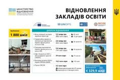 Так, 112 закладів освіти будуть відбудовані в рамках Надзвичайної кредитної програми для відновлення України та Програми відновлення України, що фінансуються за рахунок коштів Європейського інвестиційного банку. Загалом на це буде скеровано 7,13 млрд грн за двома програмами.