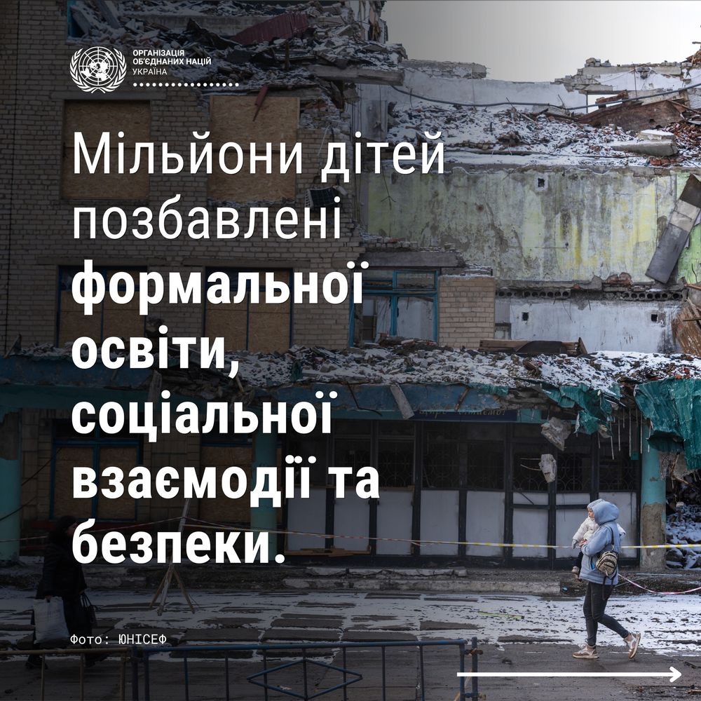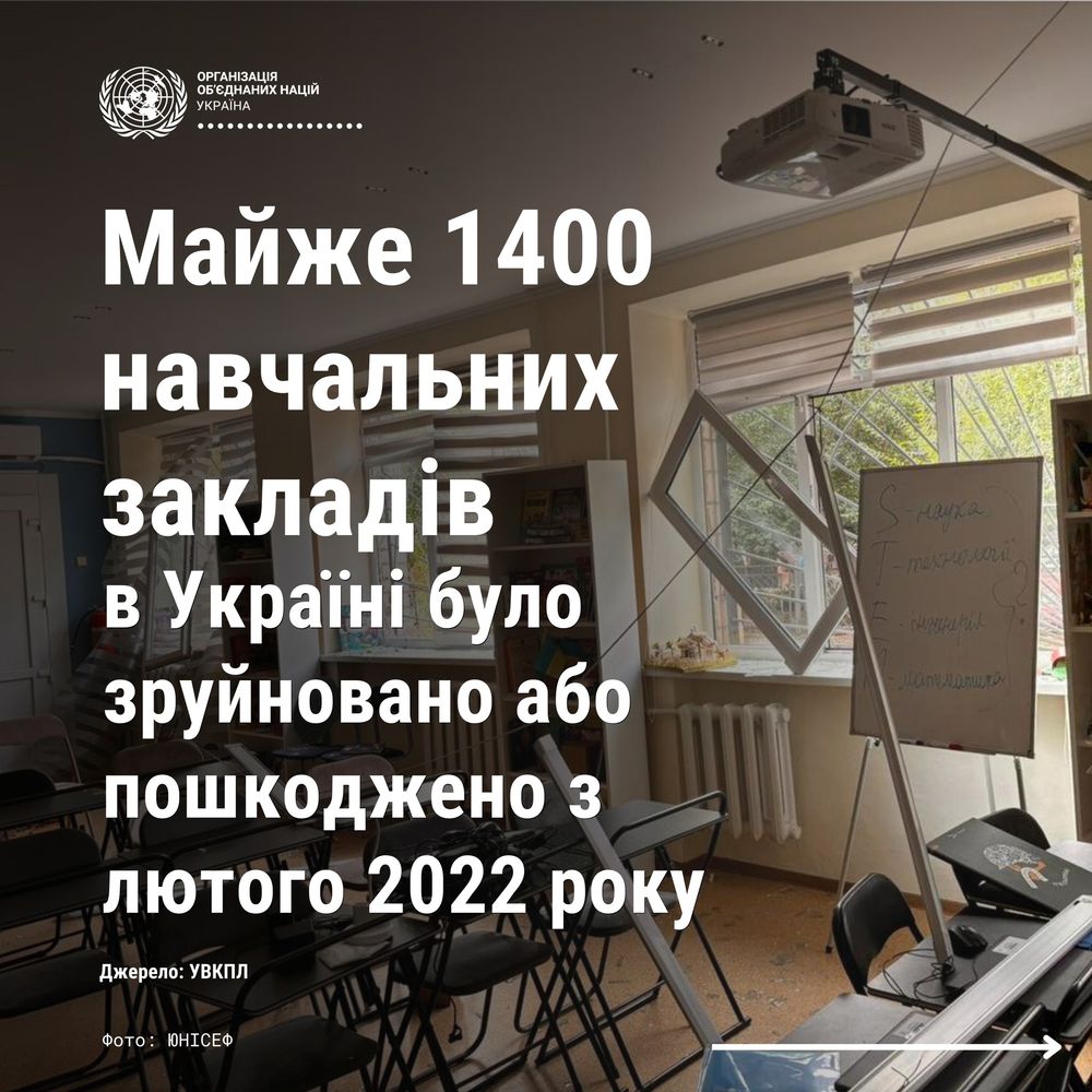 Відповідно до даних Моніторингової місії ООН з прав людини / UN Human Rights Monitoring Mission, з лютого 2022 року було зруйновано або пошкоджено майже 1 400 навчальних закладів. Через руйнування шкіл мільйони дітей позбавлені права на освіту, соціальні контакти та безпеку.