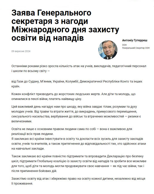 Заява Генерального секретаря з нагоди Міжнародного дня захисту освіти від нападів