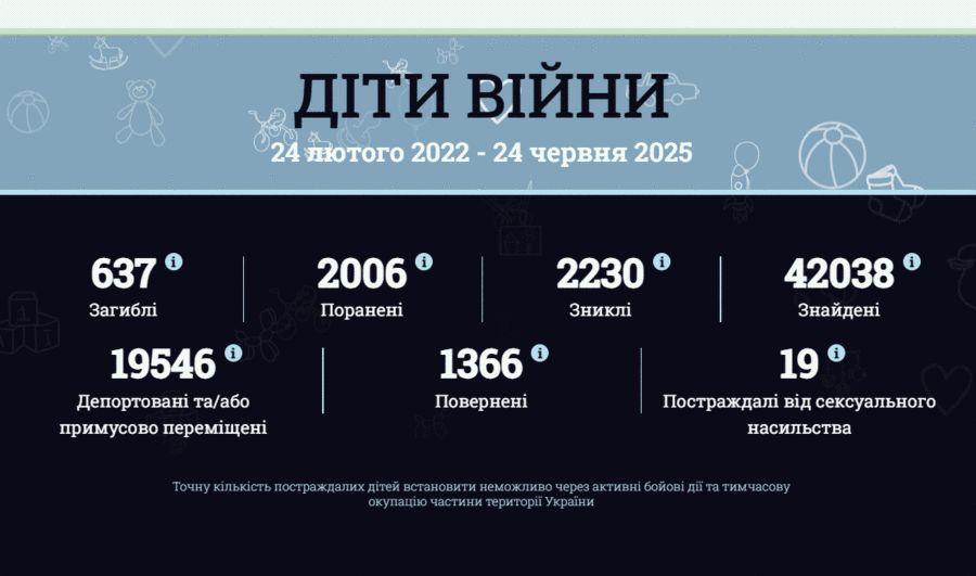 За офіційною інформацією ювенальних прокурорів та Національної поліції України 635 дітей загинули та понад 2006 отримали поранення різного ступеня тяжкості. Загалом більше ніж 2600 дітей постраждали в Україні внаслідок повномасштабної збройної агресії рф.