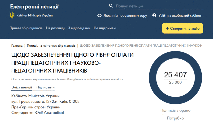 Петиція набрала необхідні 25 тисяч підписів у досить короткий термін – за неповні 4 дні. Це свідчить про величезну підтримку та небайдужість освітян і суспільства до проблеми.