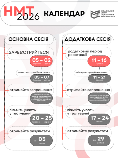 Міністерством освіти і науки України затверджено Календарний план проведення НМТ у 2026 році. Радимо майбутнім учасникам і учасницям заздалегідь занести важливі етапи до особистого календаря.