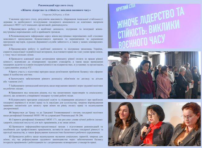 Учасники круглого столу «Жіноче лідерство та стійкість: виклики воєнного часу», що відбувся 5 березня 2026 року у Києві, у рекомендаціях відзначають, що під час повномасштабної війни жінки в Україні відіграють ключову роль у всіх сферах життя – від оборони держави до підтримки економіки.