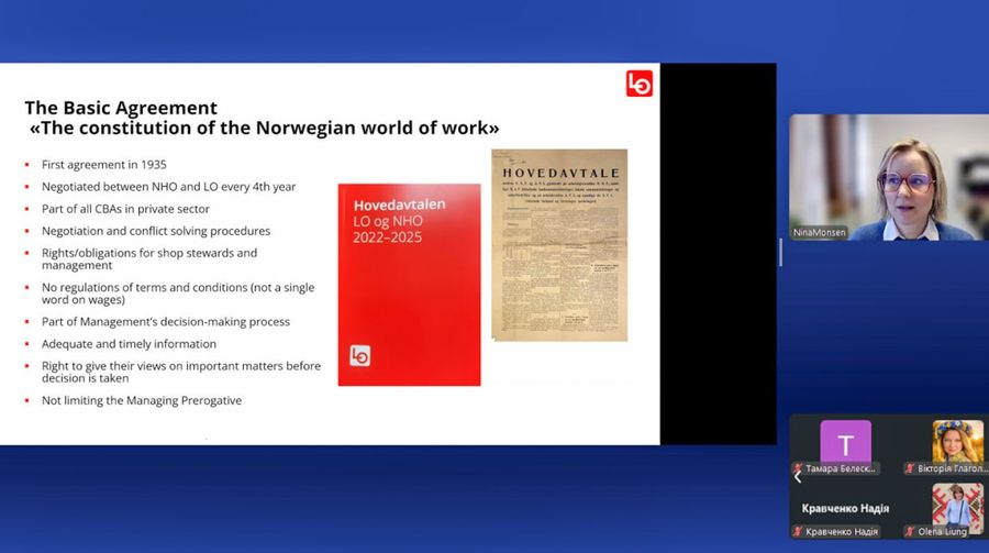 Під час вебінару учасники ознайомилися з ключовими принципами функціонування соціального діалогу в Норвегії. Зокрема, акцентувалася увага на тому, що навіть у складних умовах важливо починати переговори з тем, де сторони мають спільні інтереси. Такий підхід допомагає швидше досягати домовленостей і формує позитивний досвід співпраці задля спілчан.