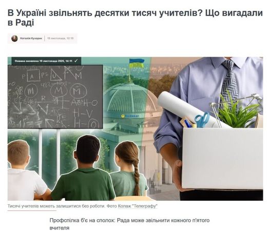У першій статті йдеться про потенційно масштабне скорочення педагогічних працівників «В Україні звільнять десятки тисяч учителів? Що вигадали в Раді».